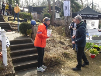 Lauf 2 - BT-Meile: Ein Frühlingstag, wie ich ihn mag - kräftiger Dauerregen und 4 Grad immerhin über Null. Also nichts für Warmduscher. Da wird bereits die Anreise zur Strapaze. Dank des von der Berliner Turnerschaft eingesetzten Shuttle-Busses kam ich dann zwar pünktlich beim Bootshaus an, los ging es jedoch erst 20 Minuten später. Eine endlose Warteschlange,dem Regen hilflos ausgesetzt, bei der Startnummernausgabe der Voranmelder. Klar im Vorteil waren die Nachmelder,diese brauchten nicht zu warten. Das sollte doch besser in den Griff zu bekommen sein - mein Vorschlag: statt Nachmeldegebühr im nächsten Jahr eine Voranmeldegebühr einführen, oder doch ein Paar mehr Helfer bei der Ausgabe einsetzen. Nachdem diese Hürde genommen war, am besten Taucherbrille auf und rein in den Schlamm. Ich hoffe, ihr besitzt alle eine gute Waschmaschine, um die Laufbekleidung wieder sauber zu bekommen. Im Ziel angekommen konnte man gleich zwei mal gewinnen - entweder den Lauf oder in der Tombola oder beides. Perfekt wäre es, wenn für mitgereiste Angehörige im Gebäude bei diesem Wetter eine gastronomische Betreuung möglich wäre.