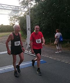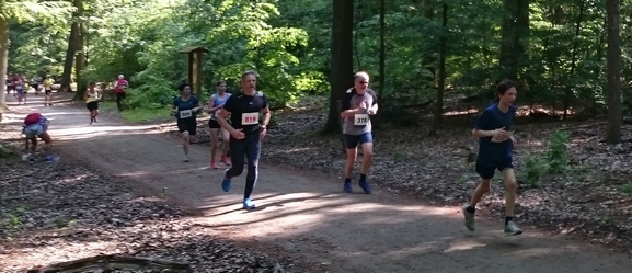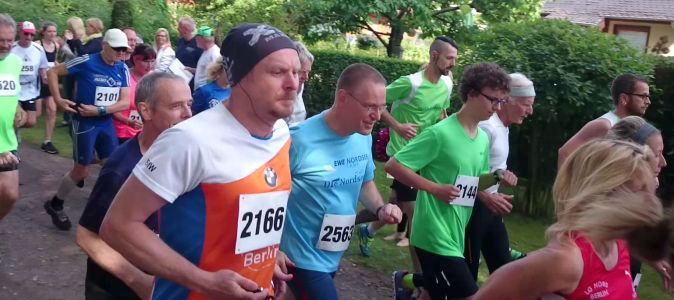 Lauf 8 - Jedermannlauf Tegeler Forst: Bestes Laufwetter, nicht zu warm und alle Zieleinläufer strahlten mit der Sonne um die Wette. Eine landschaftlich sehr schöne Waldrunde mit einigen Hügeln musste wie immer hier zwei mal durchlaufen werden. Eine Aufholjagd kann da schon ganz schön anstrengen, kurz vor dem Ziel habe ich aber Edgar Streese, mit dem ich in einer Altersklasse laufe, doch noch überholt. Hoffentlich nimmt er mir das nicht übel und dreht weiterhin alle hochkant stehenden Seiten in Bernhard Beckers Ergebnislisten waagerecht, damit wir uns nicht den Kopf verdrehen müssen. Toll die Zielverpflegung - die Helfer wissen eben genau, was für Läufer gesund ist. Das obligatorische Angebot an Schmalzstullen wurde diesmal um Nutellaschnitten erweitert. Davon war ausreichend vorhanden; wer wollte, konnte beides nehmen und je nach Geschmack auch zusammenklappen. Sehr gelungener Lauf in unberührter Natur.
