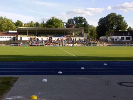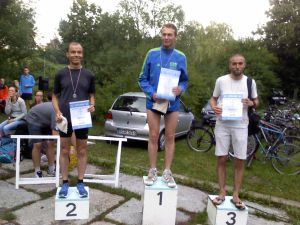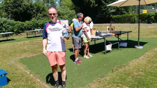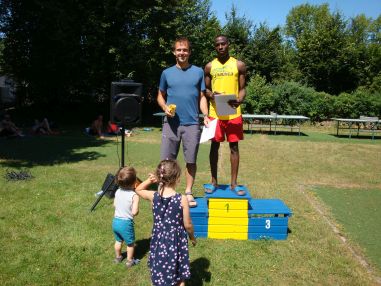 Lauf 11 - Helios Grunewaldlauf: Urlaub vorbei, also am Sonntag früh zeitig aufstehen und ab in den Grunewald! Dieser Lauf bietet wirklich alles, was sich ein Läufer so wünschen kann. Ein großer Sportplatz als Start und Ziel, Verpflegung im Ziel mit Mineralwasser, Äpfeln und Bananen; zu kaufen gab es Kuchen, Bratwurst und vieles mehr. Natürlich konnte man zur Abkühlung auch wieder im Pool schwimmen. Siegerehrung und eine große Tombola rundeten das Lauferlebnis dann ab und wer also etwas Glück hatte, bekam seinen Gewinn persönlich von unserem Volkslaufwart, Bernhard Becker, überreicht.