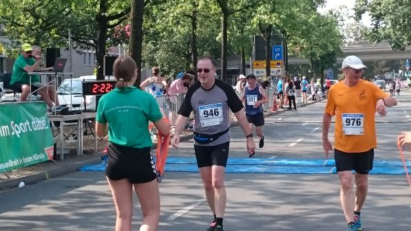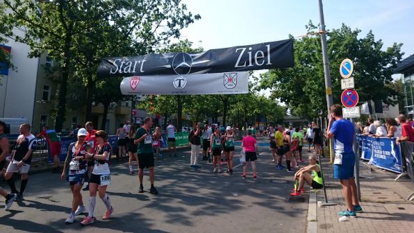 Lauf 12 - Mercedes-Benz-Halbmarathon: Hitze und sengende Sonne verlangten den Einsatz der letzten Kraftreserven. Wer, wie ich, die anvisierte 2-Stunden-Marke nicht ganz geschafft hat, kann es ja trotzdem positiv ausdrücken - z.B. 1 Stunde 65. Der Service wie gewohnt gut: Medaille für alle Finisher, Soforturkundendruck, Tombola, Obst im Ziel und Ecki Broy als Sprecher versuchte jeden Zieleinläufer namentlich anzusagen.