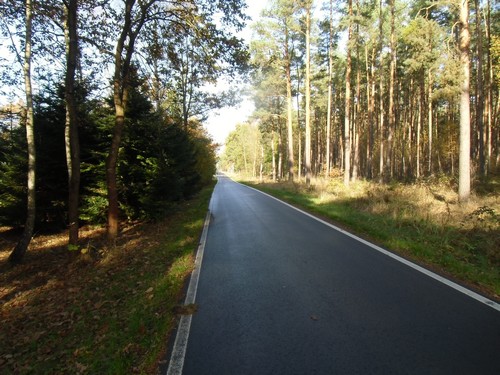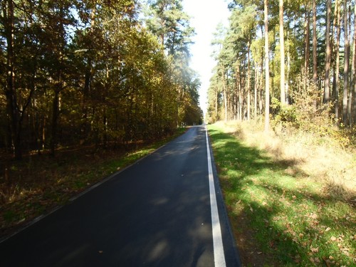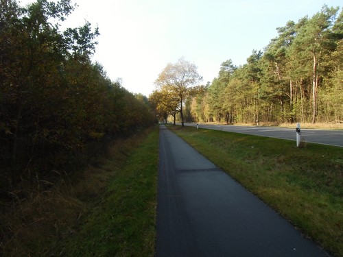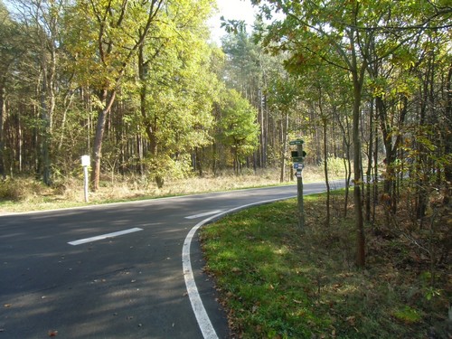 Wir nähern uns jetzt einer Landstraße und biegen links auf den aspaltierten Radweg ab.